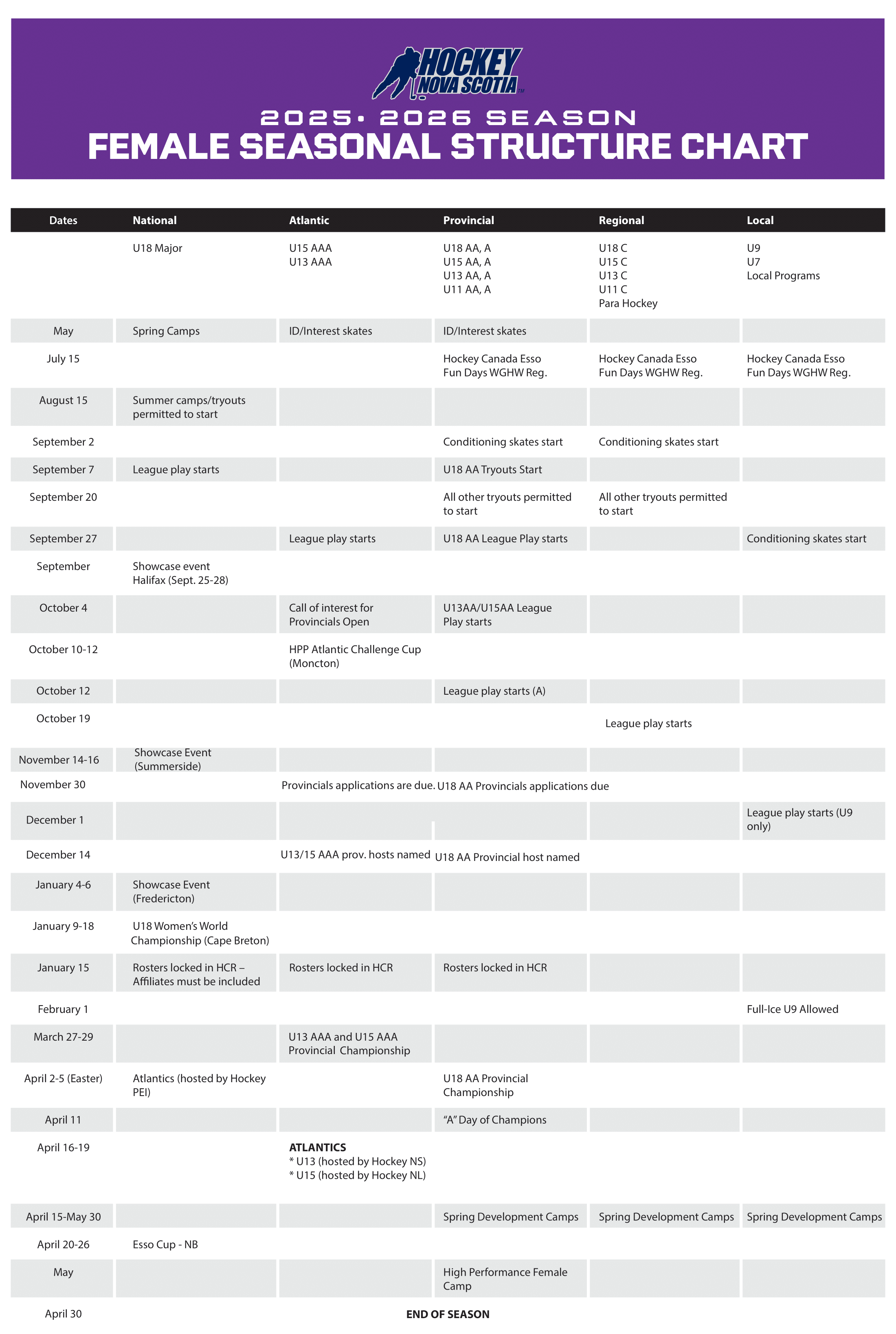 The seasonal structure chart provides a breakdown of key dates (and suggested dates) that your association or league will require as you map out the upcoming hockey year.
