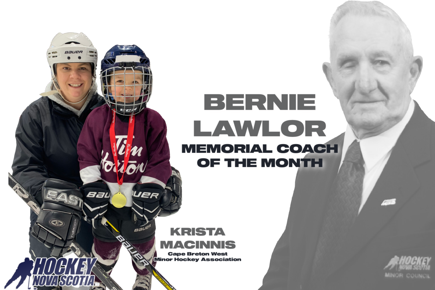 In October, Hockey Nova Scotia's Minor Council was pleased to award the Bernie Lawlor Memorial Coach of the Month Award to Cape Breton West Hockey Association coach Krista MacInnis.
